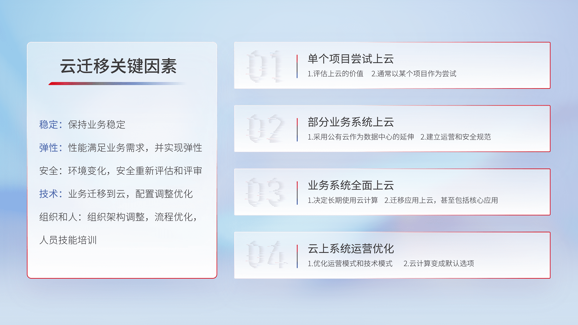 结合实际业务,,,,从规划设计、、云平台选型、、、云原生改造、、、数据迁移、、、集成交付,,迁移全过程为客户识别最佳上云路径,,,,做好风险识别管理,,,,设计网络架构、、身份权限、、、安全审计合规、、、、操作审计、、、、日志审计、、、、监控告警策略、、多站点容灾设计等,,对云上基础设施进行整体规划,,,提升IT治理水平,,,以满足弹性、、、、高可用、、高性能的需求。。。。